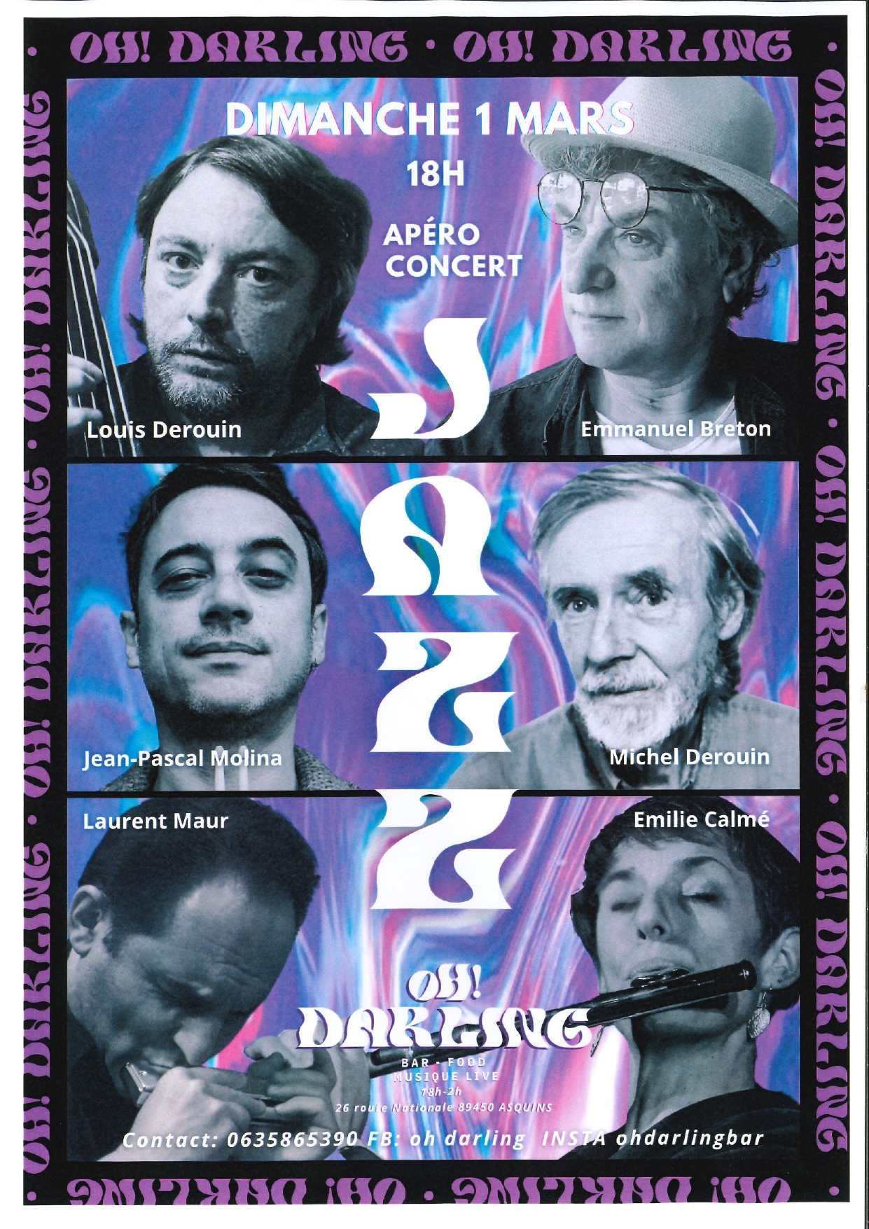 Apéro concert Jazz Michel Derouin (Piano) et ses acolytes mélomanes sont de retour @ Oh! Darling. Flûtes: Emilie Calmé Harmonicas : Laurent Maur Contrebasse Louis Derouin Batterie : Jean-Pascal Molina Congas Emmanuel Breton. Les connaisseurs taperont du pied la mesure, dodelineront de la tête en se mordant la lèvre inférieure (avec les sourcils froncés), et les amateurs pourront se délecter des grooves jazzy en toute simplicité. La nouveauté : une salle intimiste avec des places assises plus confortables!