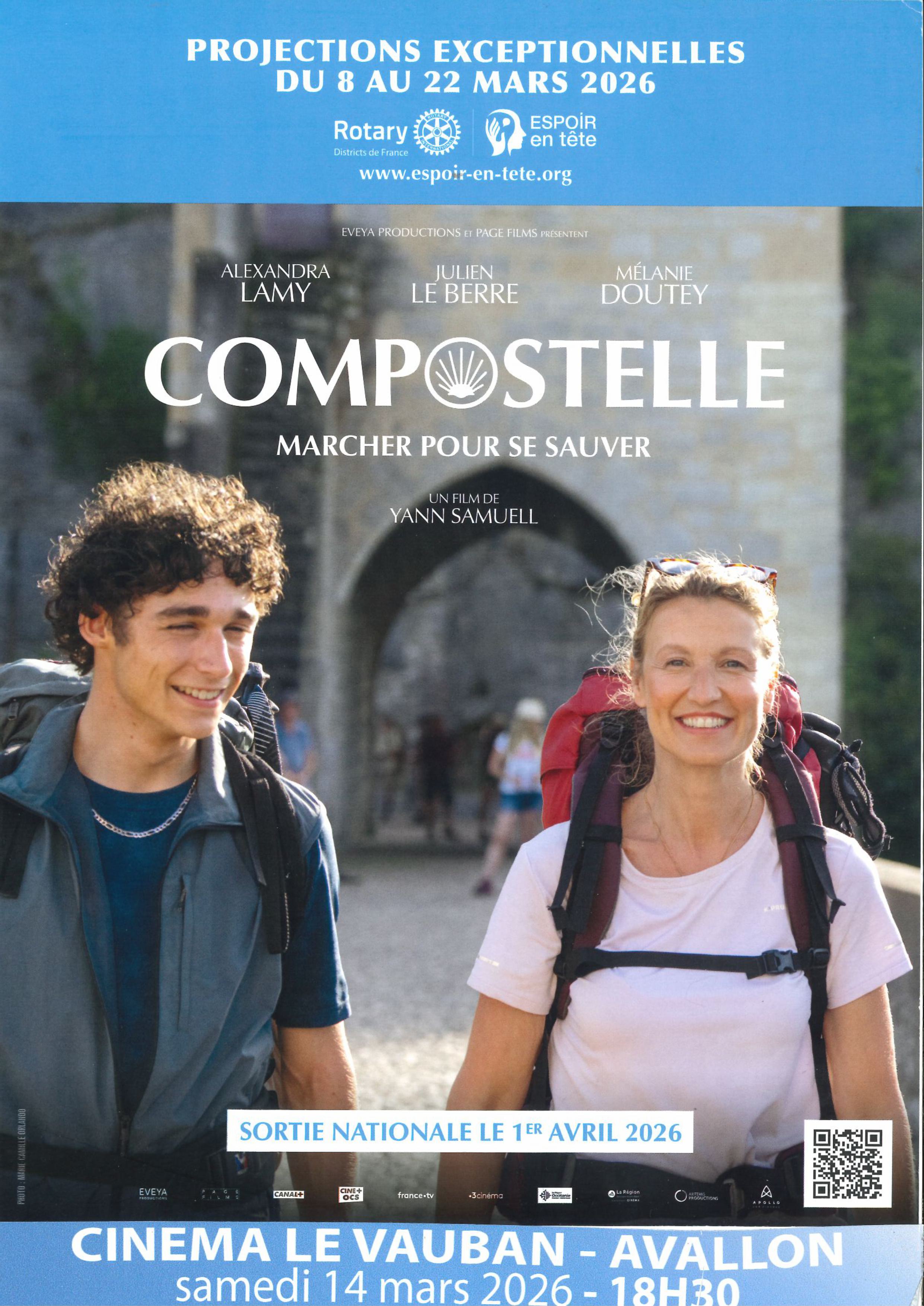 Film Compostelle - "Marcher pour se sauver" de Yann Samuell avec Alexandra Lamy, Julien Le Berre et Mélanie Doutey. Fred et Adam, un adolescent en rupture, ne se connaissent pas. Pourtant, grace à une association, ils entreprennent ensemble le pélerinage de Saint-Jacques de Compostelle. Elle cherche à apaiser son passé, il tente de canaliser sa colère et son sentiment d'abandon. Au fil des kilomètres, entre affrontements et instants suspendus, un lien fragile se tisse. Face aux épreuves du chemin, chacun découvre en lui une force insoupçonnée.