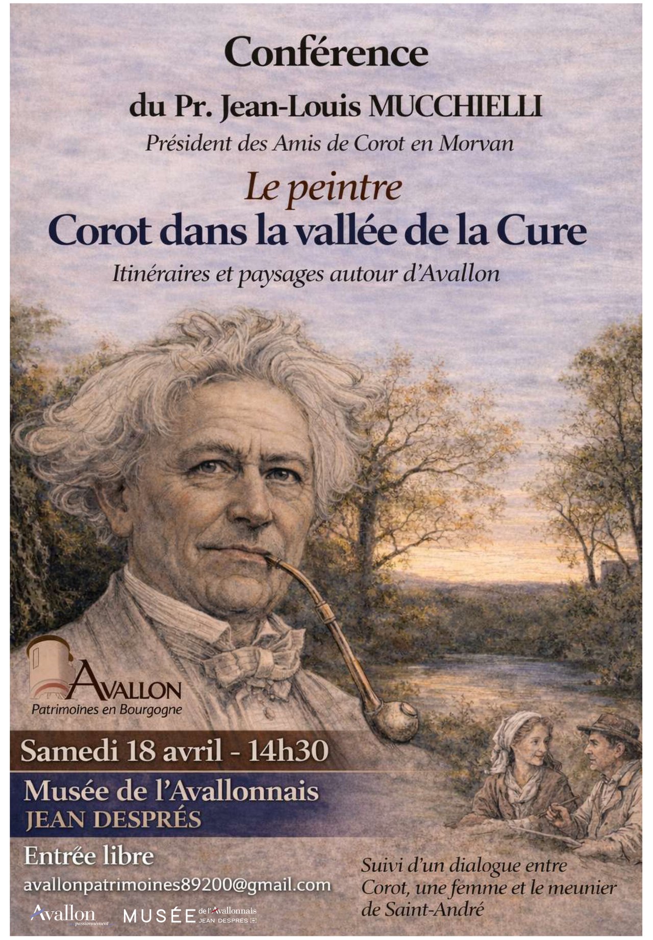 Ouverture de la saison 2026 d'Avallon Patrimoines en Bourgogne avec une conférence du Professeur Jean-Louis Mucchielli, président des Amis de Corot en Morvan, au Musée de l'Avallonnais Jean Després. Cette conférence sera suivie d'une saynète d'un dialogue entre Corot, une femme et le meunier de Saint-André.