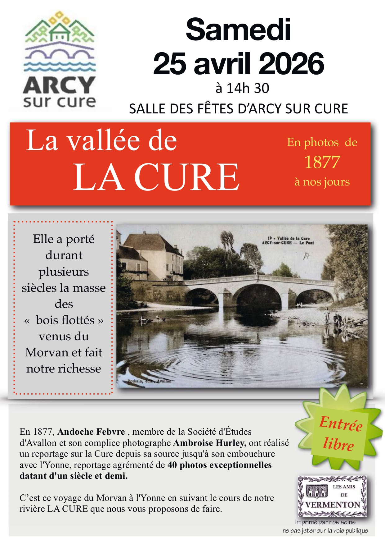 La Mairie d'Arcy-sur-Cure accueille M. Jean-Claude Ferlet de l'Association des Amis de Vermenton. Nous vous proposons une présentation inédite de la vallée de la Cure, agrémentée de photos de 1877 à nos jours. En 1877, Andoche Febvre, membre de la Société d'Études d'Avallon et son complice photographe Ambroise Hurley, ont réalisé un reportage sur la Cure depuis sa source jusqu'à son embouchure avec l'Yonne, reportage agrémenté de 40 photos exceptionnelles datant d'un siècle et demi. C’est ce voyage du Morvan à l'Yonne en suivant le cours de notre rivière LA CURE que nous vous proposons de faire.