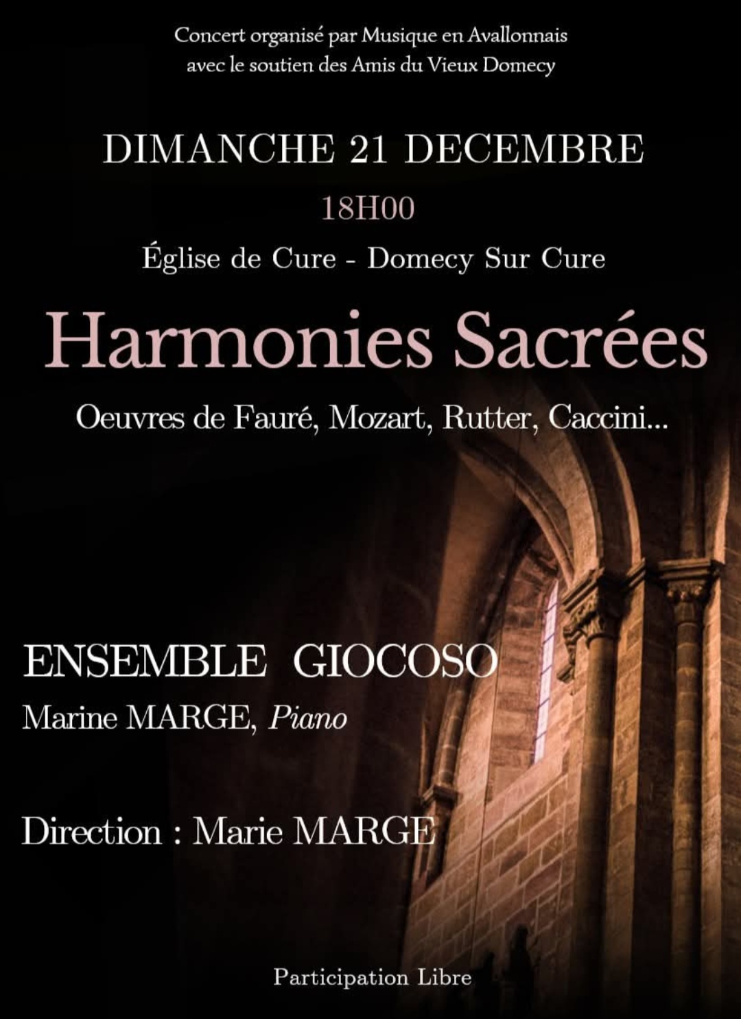Organisé par Musique en Avallonnais avec le soutien des Amis du Vieux Domecy, l'ensemble Giocoso propose "Harmonie sacrées" (Fauré, Mozart, Rutter, Caccini...) avec Marine Marge au piano.