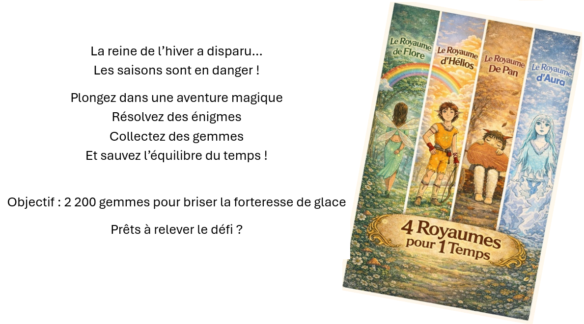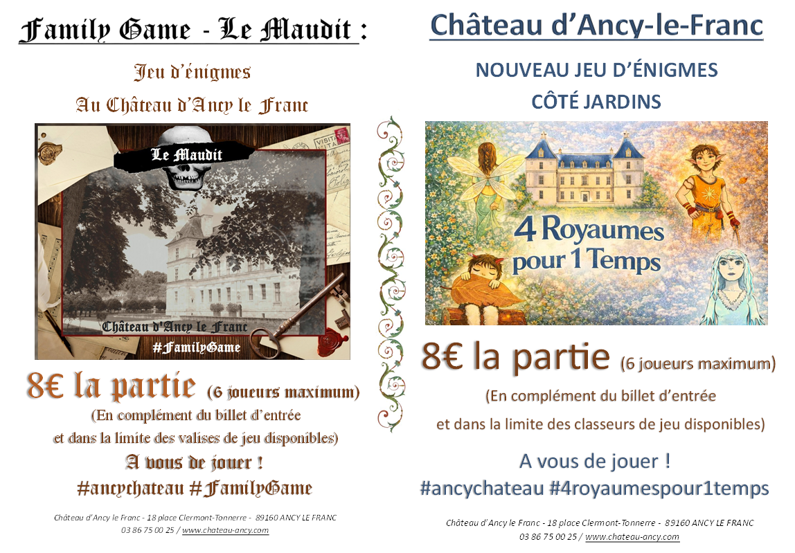 2 jeux d'énigmes au Château. "Le Maudit" pour l'intérieur. "4 Royaumes pour 1 Temps" côté jardins