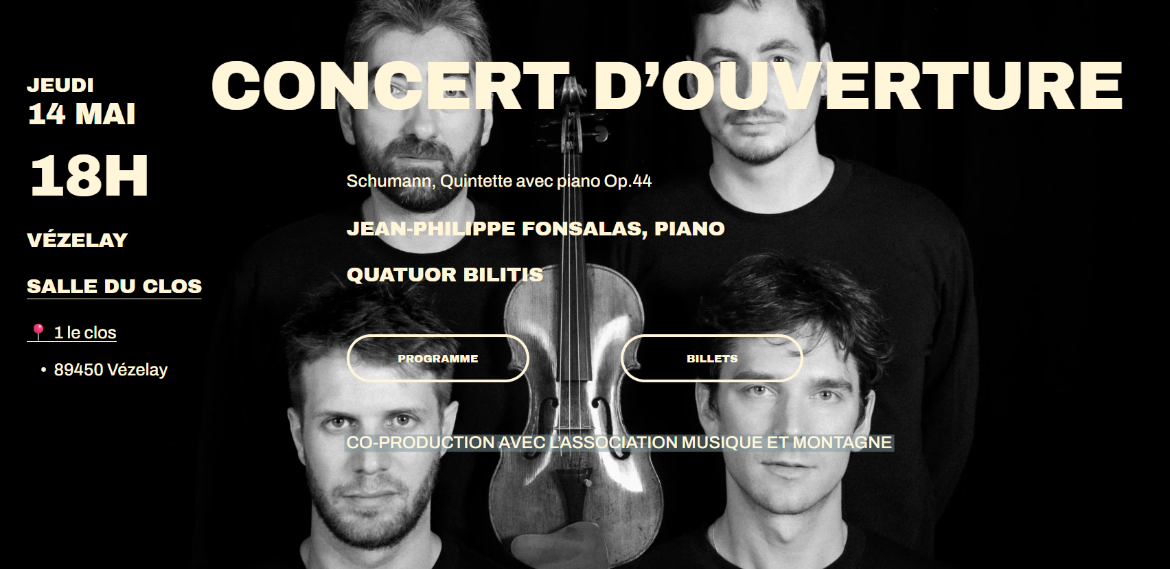L'ascension en musique propose son troisième festival de musique de chambre du 14 au 17 mai Quatuor à cordes et piano - Robert Schumann, Quintette op.44 Thibaut Maudry, Florian Perret, Violons Issey Nadaud, Alto Alexis Derouin, Violoncelle Jean-Phillipe Fonsalas, Piano La composition du Quintette lui fait passer des nuits blanches: lorsque Schumann, en très peu de temps, achève en 1842 le Quintette pour piano et cordes, il est physiquement et mentalement à bout de forces. L’œuvre cependant ne laisse rien paraître des efforts du compositeur, bien au contraire. Selon Clara Schumann, cette nouvelle œuvre est «pleine de vigueur et de fraîcheur» et aussi «des plus brillantes et impressionnantes». Même Wagner se joint à l’approbation générale. L’opus 44 se range ainsi rapidement au rang des compositions les plus populaires de Schumann et constitue aujourd’hui encore un joyau de la littérature de musique de chambre. Si le Quintette rappelle en partie un concerto pour piano avec orchestre dans les dimensions d’un quatuor à cordes, c’est qu’il était destiné au répertoire de Clara. L’œuvre est d’ailleurs aussi dédiée à la pianiste virtuose. En co-production avec l’association Musique et Montagne. Soutenu par la municipalité de Vézelay. Le concert sera suivi d’un buvette
