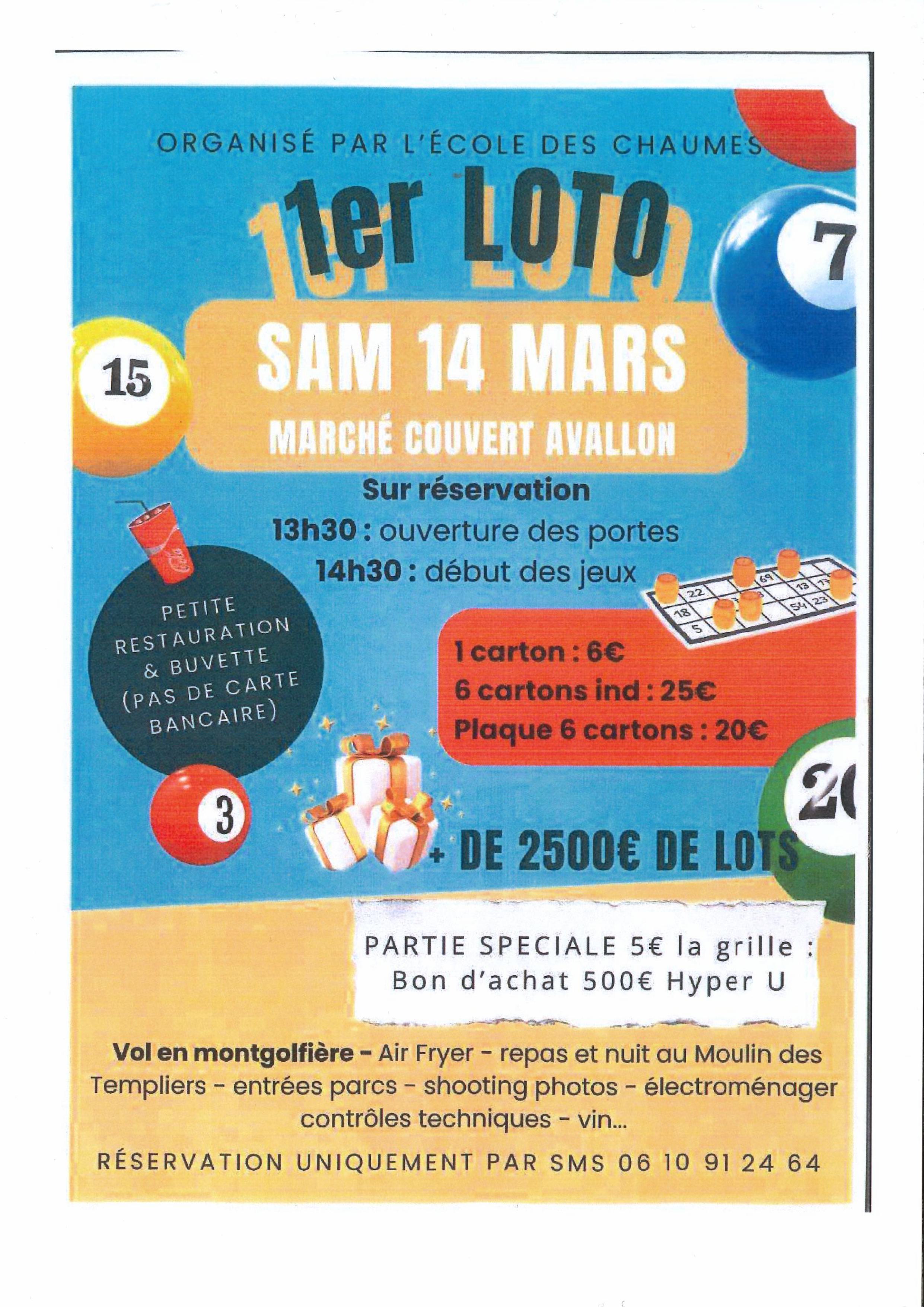 1er loto organisé par l'école des Chaumes. De nombreux lots à gagner soit plus de 2500€ de lots ( vol en montgolfière, air fryer, repas et nuit au Moulin des Templiers, entrées parcs, shooting photos, électroménager, controles techniques,vin.....Petite restauration & buvette ( pas de carte bancaire)
