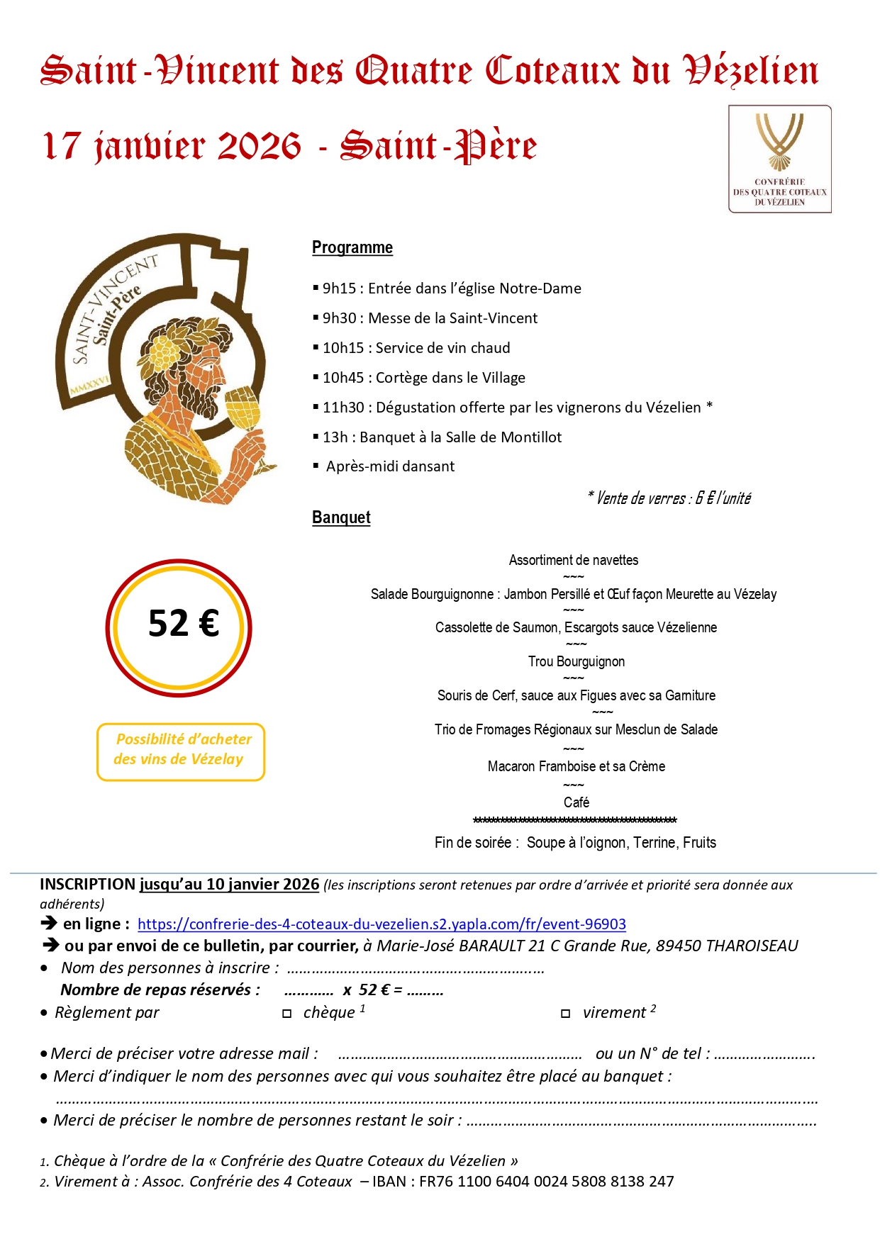 Saint-Vincent des 4 coteaux du Vézelien. 9h30 Messe dans l'église Notre-Dame à St Père, 10h15 Service du vin chaud, 10h45 Cortège dans le village, 11h30 Dégustation de vins de Vézelay* , 13h Banquet à la Salle de Montillot, après-midi dansant, et soupe à l'oignon en soirée. * vente de verres: 6€ l'unité. Inscription avant le 10 janvier 2026