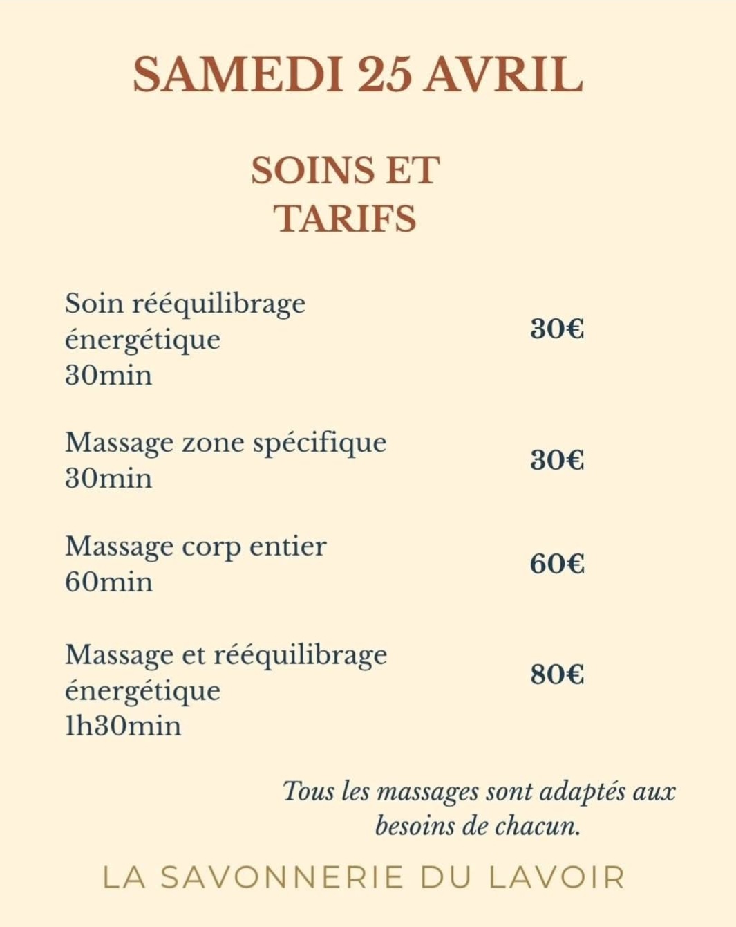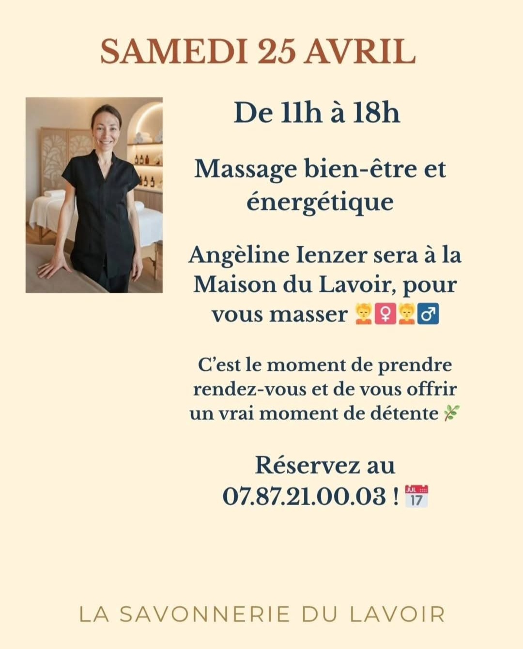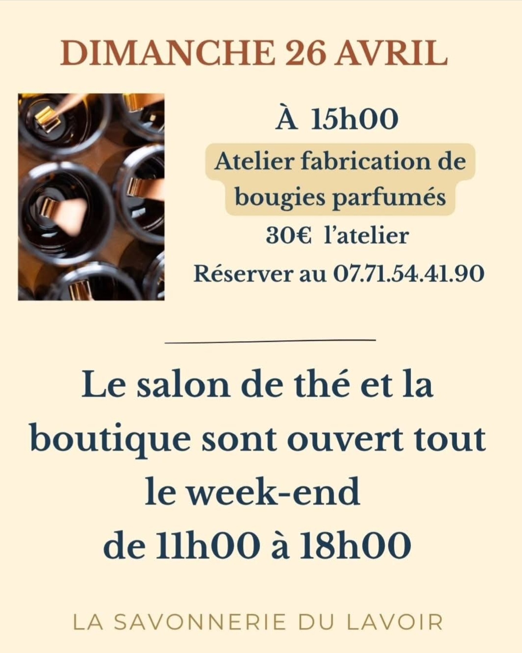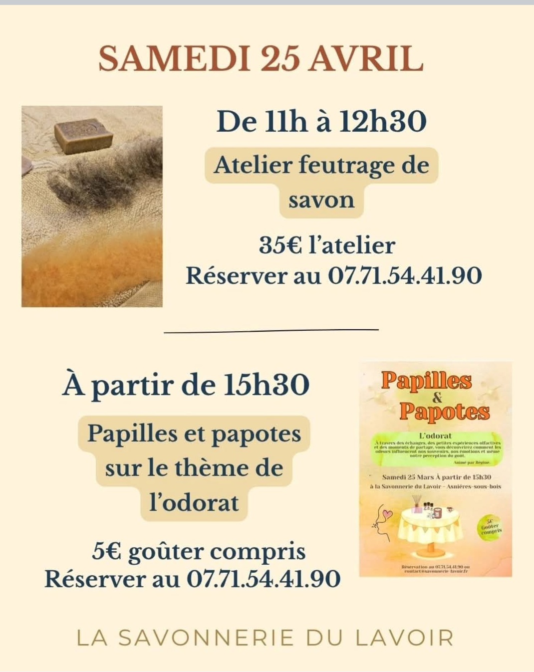 Pour son prochain week-end d'ouverture, la Savonnerie du lavoir vous propose des animations : Samedi 25 avril De 11 h à 12 h 30 : atelier feutrage de savon. 35€ l'atelier. Réservation : 07 71 54 41 90 A partir de 15 h 30 "Papilles et papotes sur le thème de l'odorat" 5€ goûter compris. Réservation : 07 71 54 41 90 De 11 h à 18 h : massage bien-être et énergétique avec Angeline Ienzer. Reservation : 07 87 21 00 03 Dimanche 26 avril A 15h : atelier fabrication et bougies parfumés. 30€ l'atelier. Réservation : 07 71 54 41 90