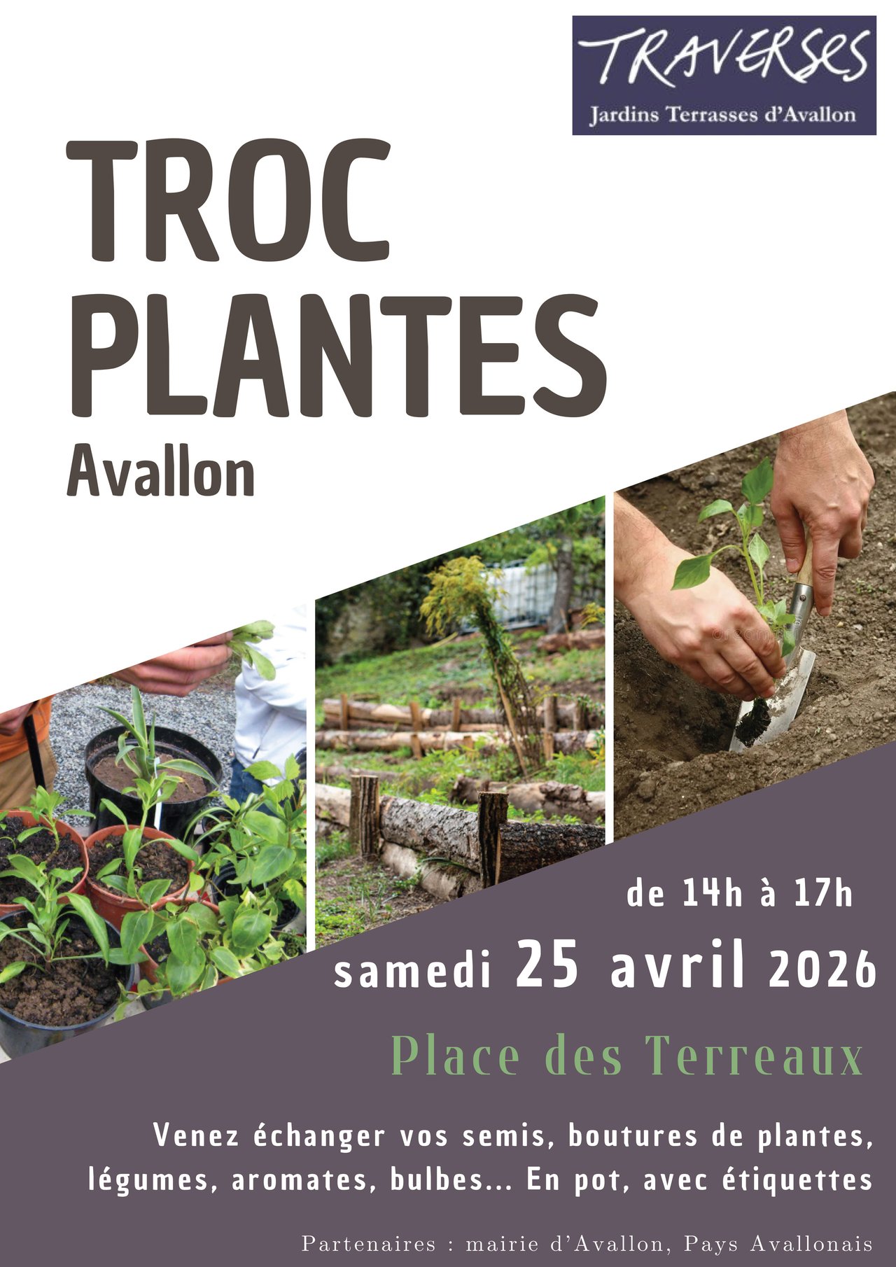 L'association Traverses organise son 6ème Troc de plantes. Vous avez des semis en trop, des boutures, des graines ? Vous nettoyez votre jardin ? Mettez dans des petits pots, avec étiquettes, et hop ! Rendez-vous le 25 avril pour échanger dans une ambiance conviviale. Pour le plaisir de partager, 1 plante apportée = 1 ticket pour une plante Vous n'avez rien ? l'association Traverses a fait du nettoyage, il y aura du rab...